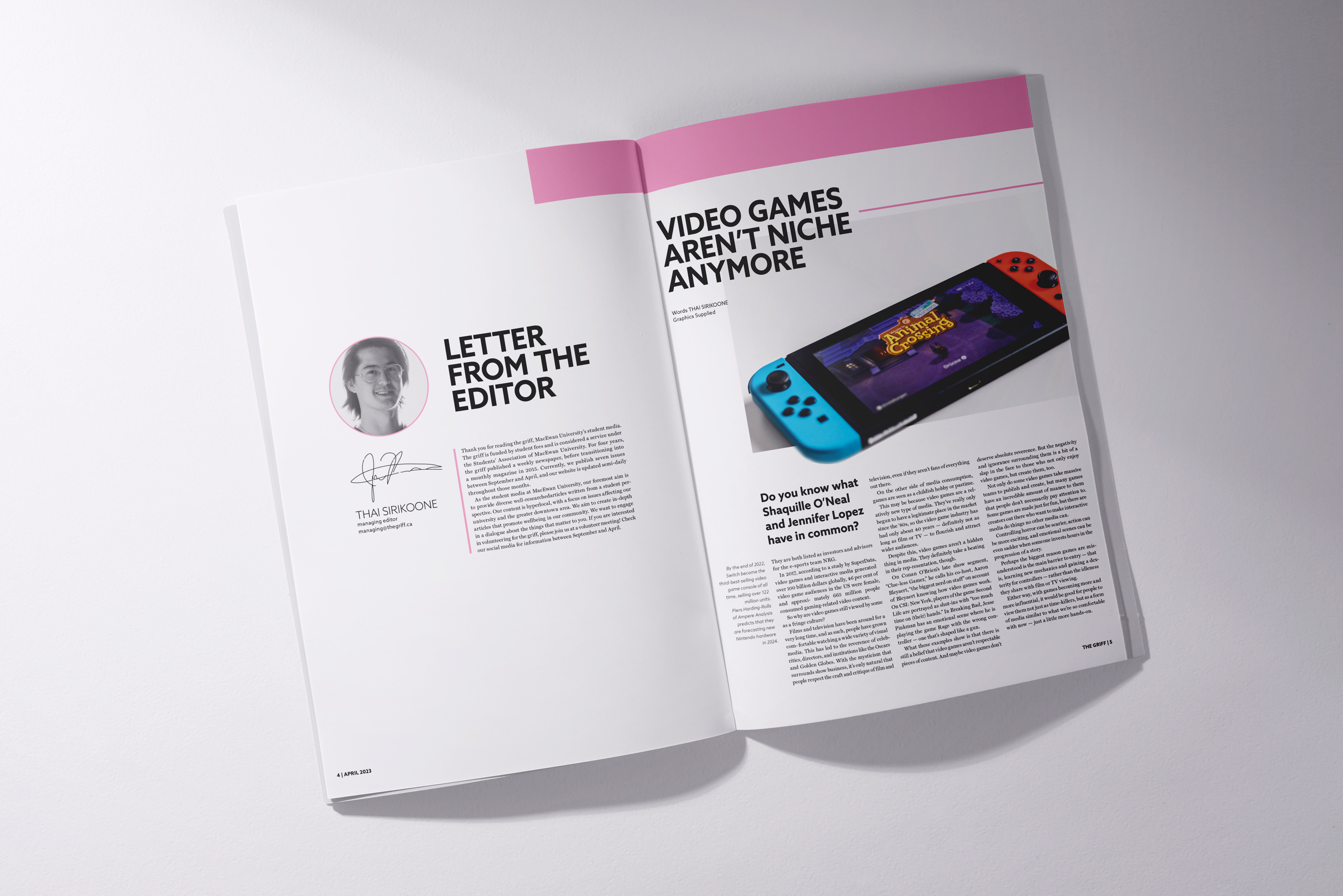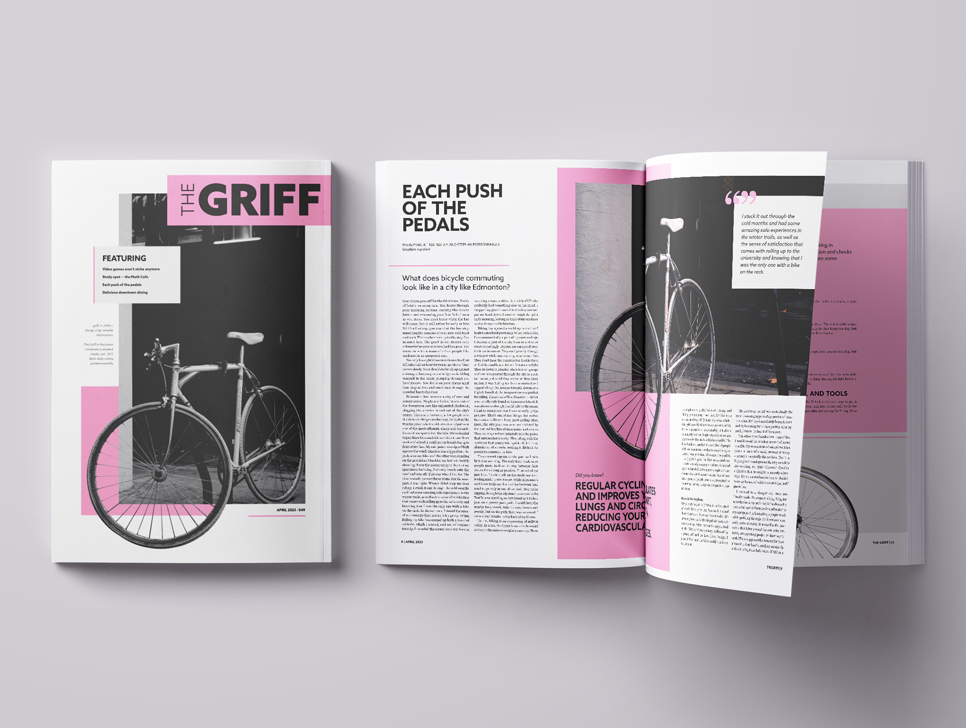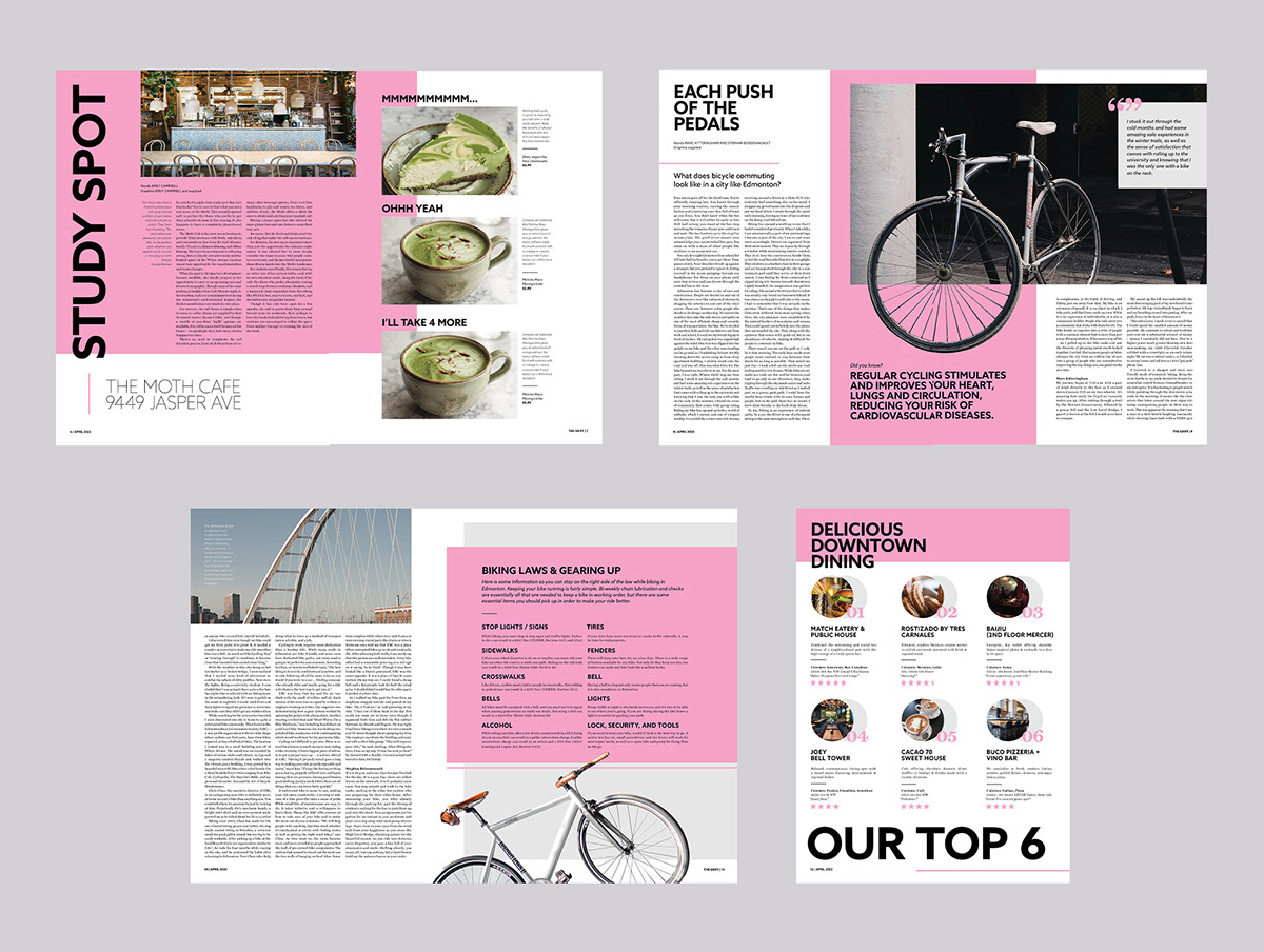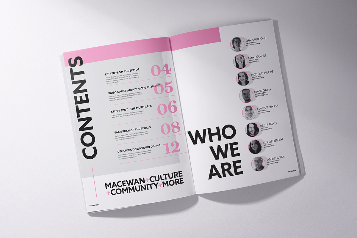 For this publication design project, I reimagined MacEwan University’s student magazine, The Griff, with a bold and contemporary visual direction. The redesign embraces a fun, energetic pink palette paired with clean typography to create a fresh and youthful tone. I explored unique layout structures that intentionally break traditional grid patterns, giving each spread a dynamic, editorial feel while still maintaining readability and hierarchy. The result is a modern, engaging magazine that feels expressive, student-focused, and visually memorable.